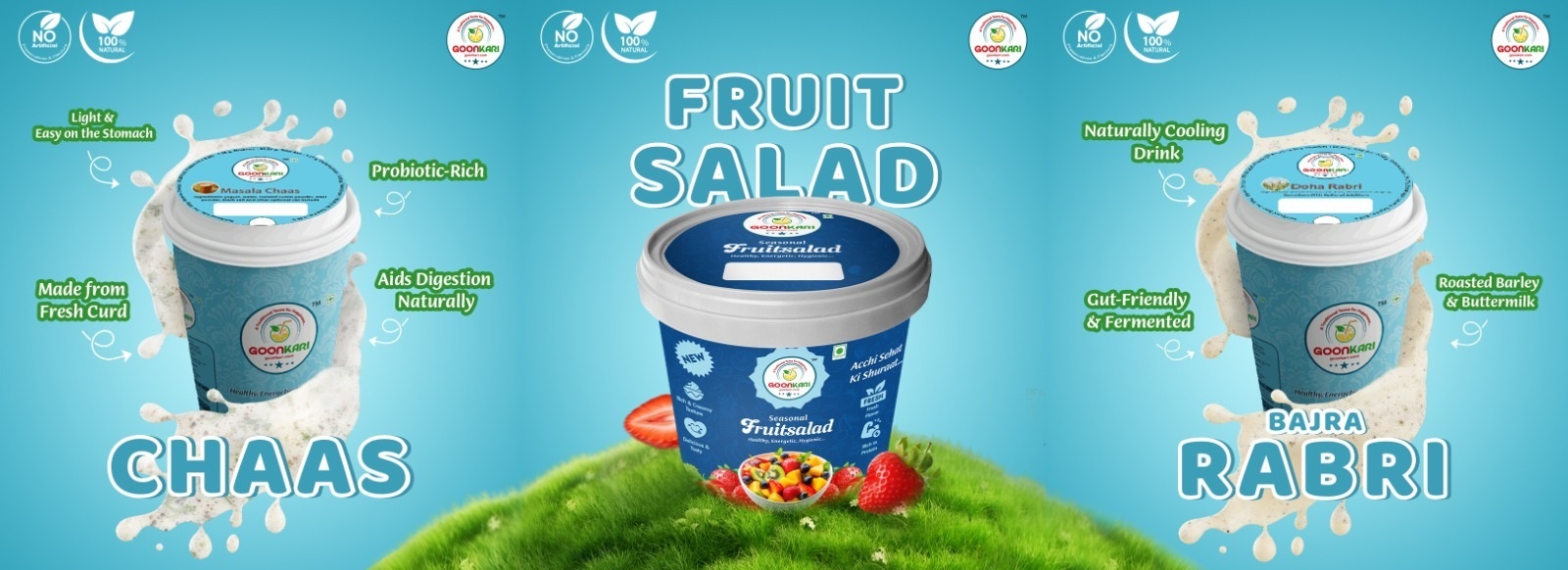 SUJANGARHIYA’S FOOD AND BEVERAGES Brings-“GOONKARI“ Goonkari is a celebration of India’s age-old taste and timeless warmth. We bring you the creamy delight of lassi and Doha rabdi, the cooling calm of chaas and shikanji, and the natural sweetness of gulkand and fresh fruit salad — all crafted with love, just like home. Every product is a blend of purity, tradition, and soul — created to refresh your body and comfort your heart.